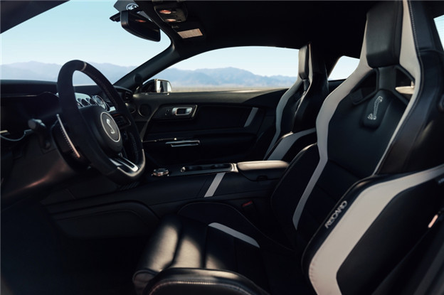 內裝部分則拆除後排座椅,雙前座改採Recaro黑白雙色賽車椅,以及大量皮革、麂皮包覆的方向盤和門邊飾板,中控台則使用碳纖維花紋來營造熱血的駕馭氛圍;當然,為滿足聲光效果,Shelby GT500 也配置 Ford 最新的 8 吋 SYNC 3 中央資訊娛樂系統、12具揚聲器 B&O 環繞音響系統和 12 吋全彩數位儀表。