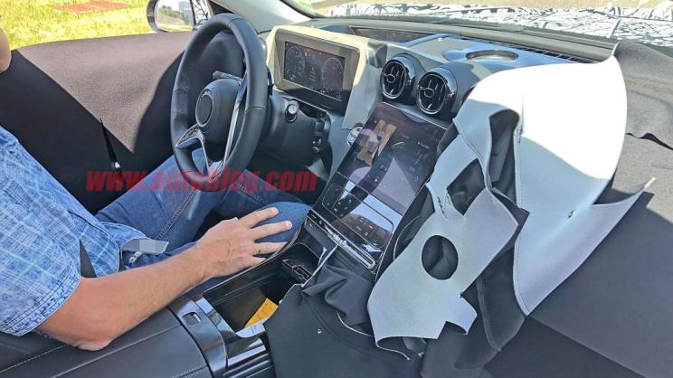 在此前內飾諜照看,全新的C-class設計風格有別於現款的樣式,平治標志性的圓形出風口被放置在中控螢幕上方。新車搭載了一塊全液晶儀錶盤,凸顯出車內的科技感。採用一塊大尺寸的中控螢幕,下方集成冷氣控制台,預計將會有觸覺回饋以便於盲操作。
