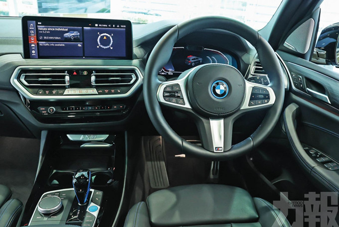 iX3車廂可升級選用Vernasca真皮座椅,前座為運動型設計連電熱功能,標配12.3吋全數碼儀錶板和12.3吋觸控中央熒幕,配合iDrive 7.0系統,可使用廣東話聲控語音功能,更備有原廠中港澳三地導航,為駕駛人士提供強大的支援。iX3的啟動/停止按鈕選用藍色配襯波棍,突顯i 藍色標籤。全景玻璃車頂亦是車廂內另一焦點,令到車廂空間感覺開揚。